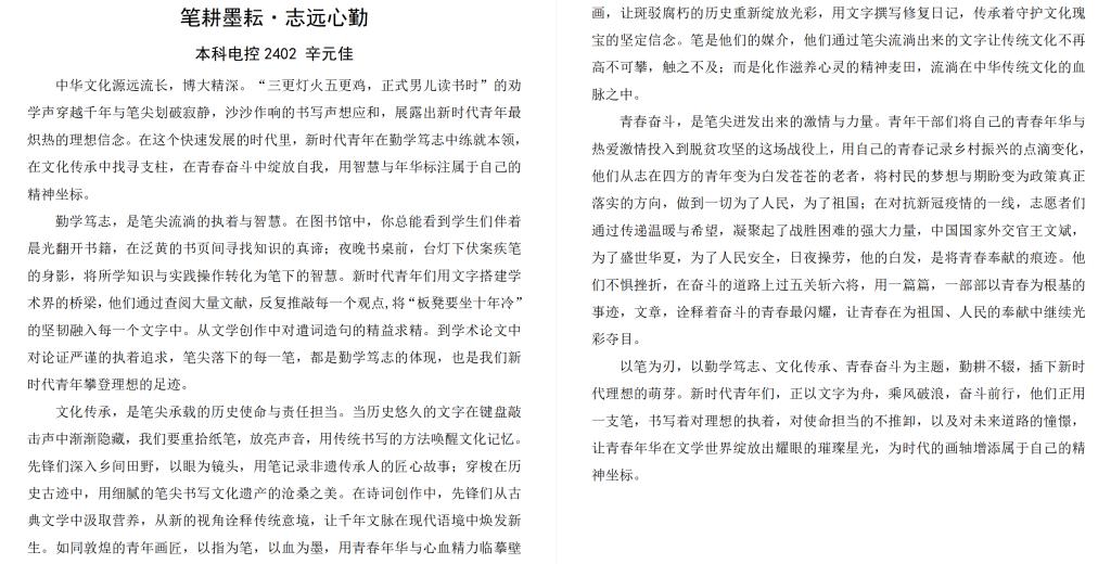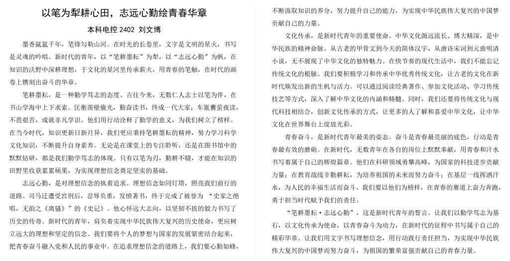 此次比赛以系列课程中多元阅读素材为依托,鼓励同学们在深度阅读的基础上,将思考感悟转化为笔下文字。活动启动后,同学们踊跃参与,围绕主题进行多维创作,内容涵盖文化传承、青春奋斗、勤学笃志等多个方面。有回溯文化传承脉络,书写传统与现代交融的思考;有聚焦青春奋斗日常,记录实验室里的灯火、竞赛场上的拼搏;更有锚定勤学笃志初心,抒发以知识为翼、逐梦远方的热忱等。其中,本科电控2402班的辛元佳同学用细腻的笔触勾勒出电气学子“志存高远、笔耕不辍”的精神群像,荣获活动一等奖。