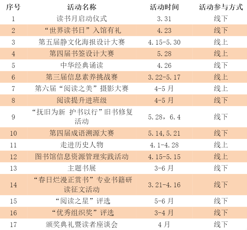本届读书月活动将组织“第五届静文化海报设计大赛”、“第四届书签设计大赛”、“第三届信息素养挑战赛”、“中华经典诵读”等17项读书活动,各项活动根据参与员工人数分别设立奖项,充分为员工成长发展搭建平台,提供舞台,不断丰富员工的校园文化生活。